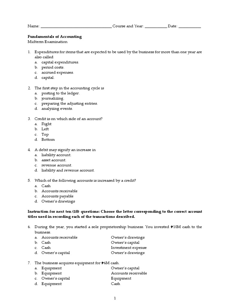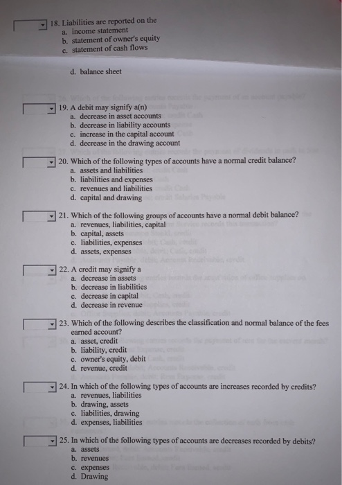 Decrease in liability accounts c. Accounting questions and answers. Increase in the capital account d.