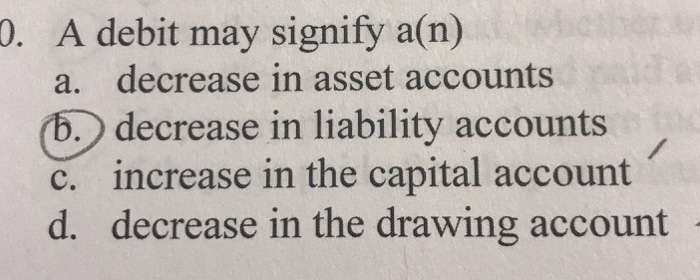 Decrease in the drawing account. Decrease in asset accounts B. A debit may signify a.